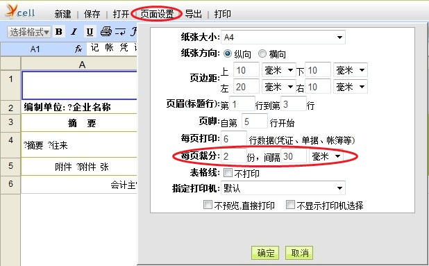 如果你要一张A4纸上打印出两张或者三张凭证,你可以点击凭证打印按钮旁边的三角,在报表设计器里面,点击 页面设置-->一页裁分里面输入2或者3,再输入每份的间隔即可。如下图: